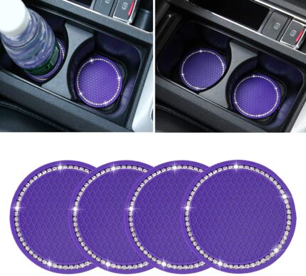 DIY1234 4 Pack Bling Car Coasters, 2.75 Inch Diamond Soft Rubber Pad Set Round Auto Cup Holder Insert Drink Coaster Car Interior Accessories (Purple)